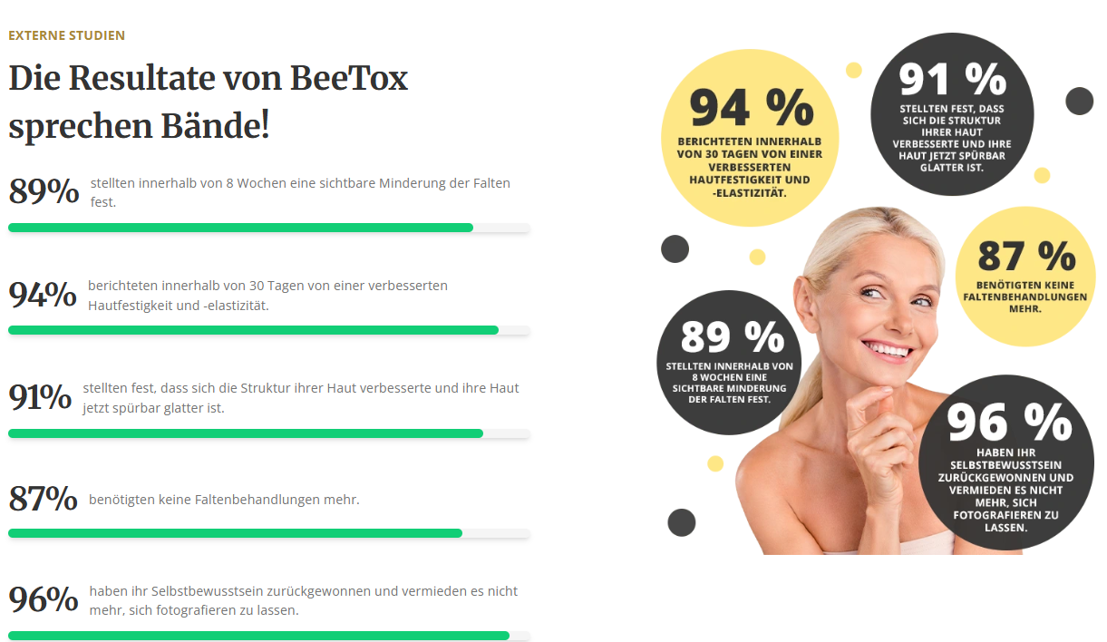 Ich habe die Anwendung über mehrere Tage beobachtet. Hier sind einige der BeeTox Anti-Aging Germany Ergebnisse: