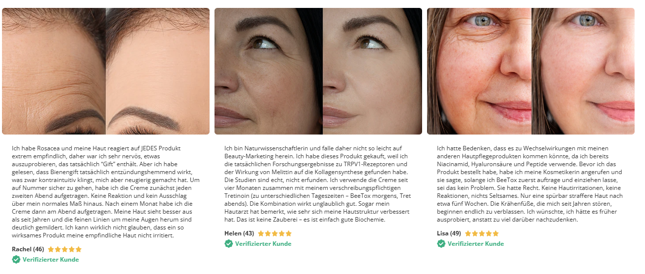 Ich habe die Anwendung über mehrere Tage beobachtet. Hier sind einige der BeeTox Anti-Aging Germany Ergebnisse: